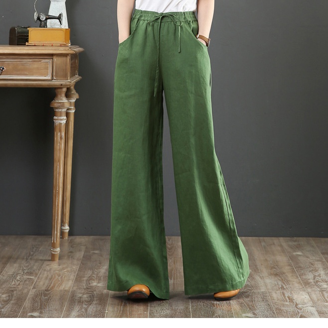 Casual wide-leg pants for women with a high waist and relaxed fit. Made from breathable, eco-friendly cotton linen with anti-wrinkle and anti-pilling features. Designed for everyday spring and summer wear, featuring convenient pockets and a drawstring waist. Available in green and orange, with optional custom logo printing.
